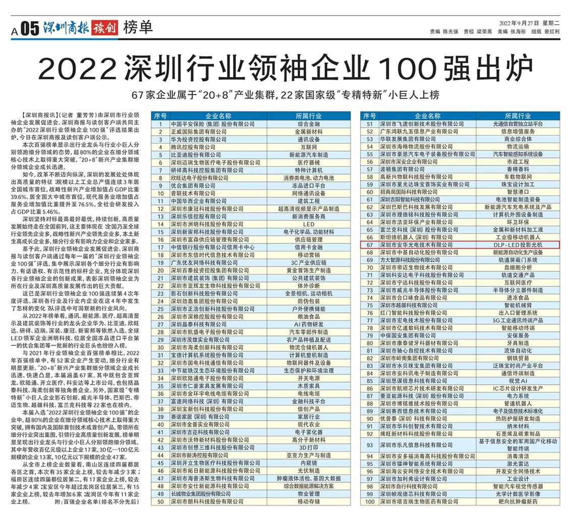 9月27日,由深圳市行業(yè)領(lǐng)袖企業(yè)發(fā)展促進(jìn)會(huì)、深圳商報(bào)與讀創(chuàng)客戶端共同主辦的“2022深圳行業(yè)領(lǐng)袖企業(yè)100強(qiáng)”評(píng)選結(jié)果出爐,在深圳商報(bào)及讀創(chuàng)客戶端公示,安華光電作為投影光機(jī)行業(yè)的佼佼者,成功入選。