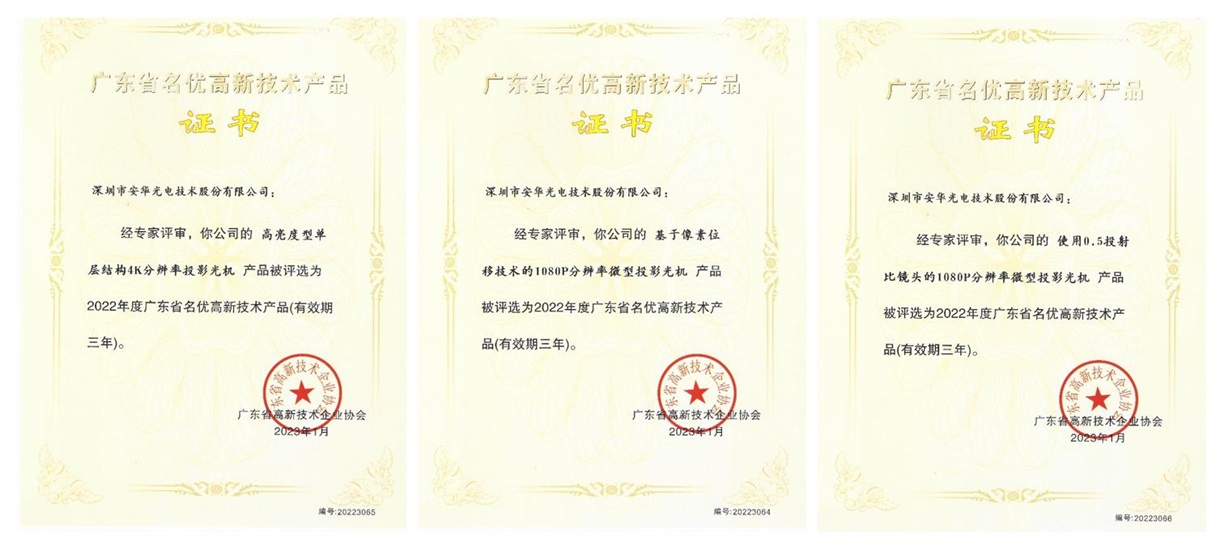 技術領先,創(chuàng)新不止。近日,廣東省高新技術企業(yè)協(xié)會公布了2022年廣東省名優(yōu)高新技術產品名單,安華光電公司申報的“基于像素位移技術的1080P分辨率微型投影光機”、“高亮度型單層結構4K分辨率投影光機”、“使用0.5投射比鏡頭的1080P分辨率微型投影光機”3項優(yōu)秀產品成功獲評。